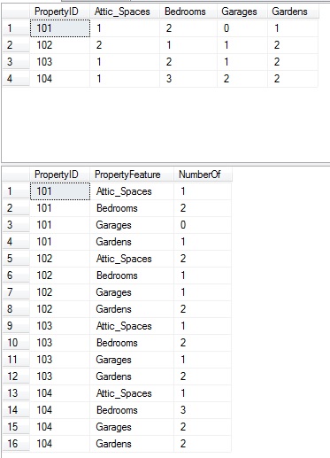 SELECT PropertyID, PropertyFeature, NumberOf FROM #Properties p UNPIVOT ( NumberOf FOR PropertyFeature IN ( Attic_Spaces, Bedrooms, Garages, Gardens ) ) AS unpvt ;