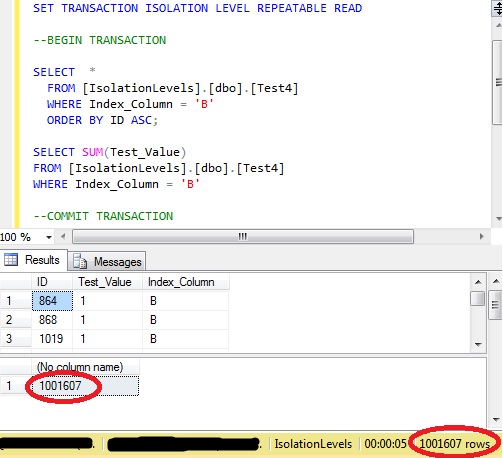 The results appear to show similar behaviour to the read committed – the row with ‘ID’ of 864 is shown in the first query as having a ‘Test_Value’ column of 1, not the 2 is was updated to and the second query has used the new value, because it was updated by the time that query started.