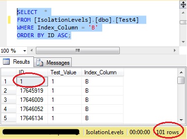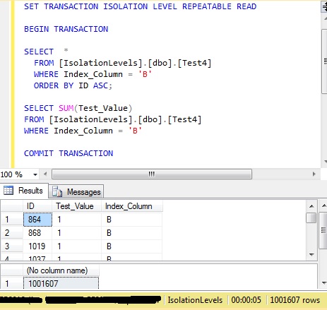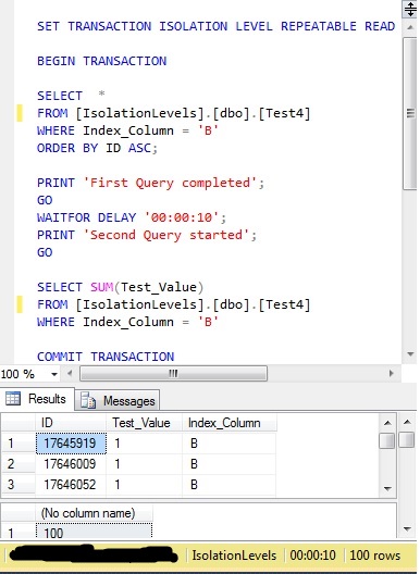 To demonstrate this, I have removed all but 100 of the rows that have ‘Index_Column’ with a value of ‘B’. A ten second delay has also been added between the two queries, in order to allow the timing of a second insert query to be executed. Both select statements are still within the same transaction, so the delay makes no difference to the execution of the commands – it just allows me to be consistent and repeatable with the actions.