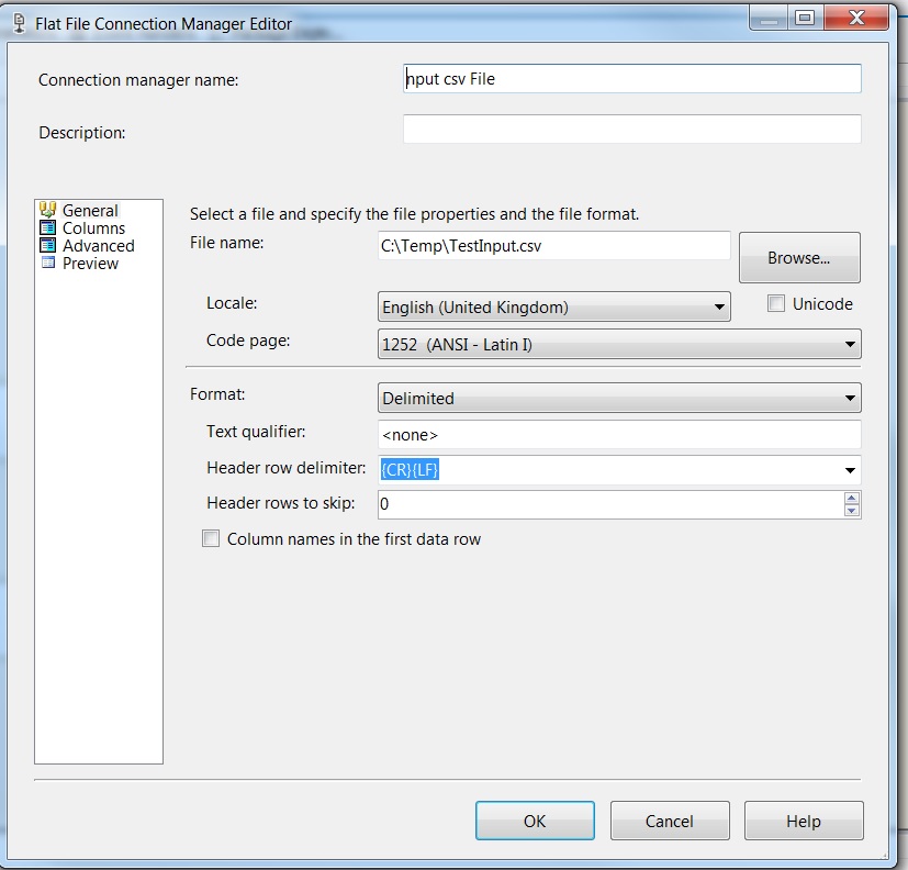 Nothing exciting in those. ‘Input csv file’ provides the details of the csv file I’m using for this simple test and ‘Target Table’ provides the details for table that will receive the csv file’s contents.