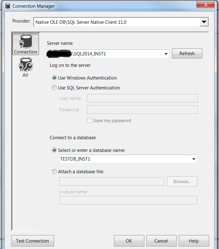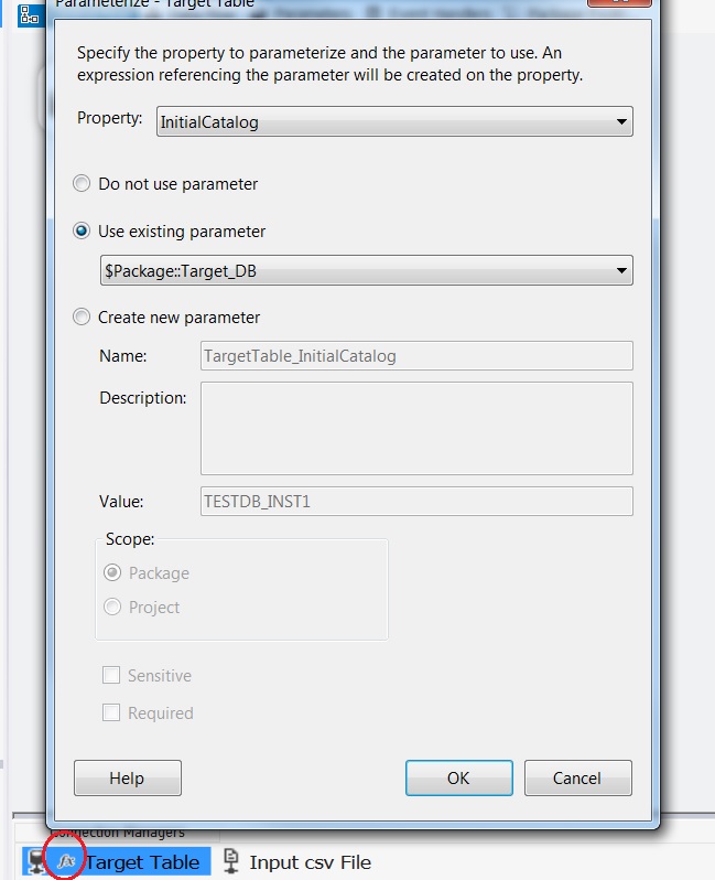 And I have also associated the parameter ‘Target_DB’ with the ‘InitialCatalog’ property of the ‘Target Table’ connection.