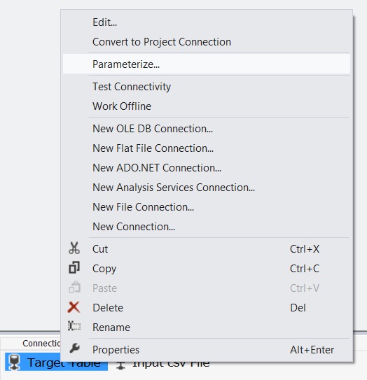 Now that the parameters have been created they need to associated with the required controls. Within the Connection Manger, right-click on the required connection and select ‘Parameterize…’.