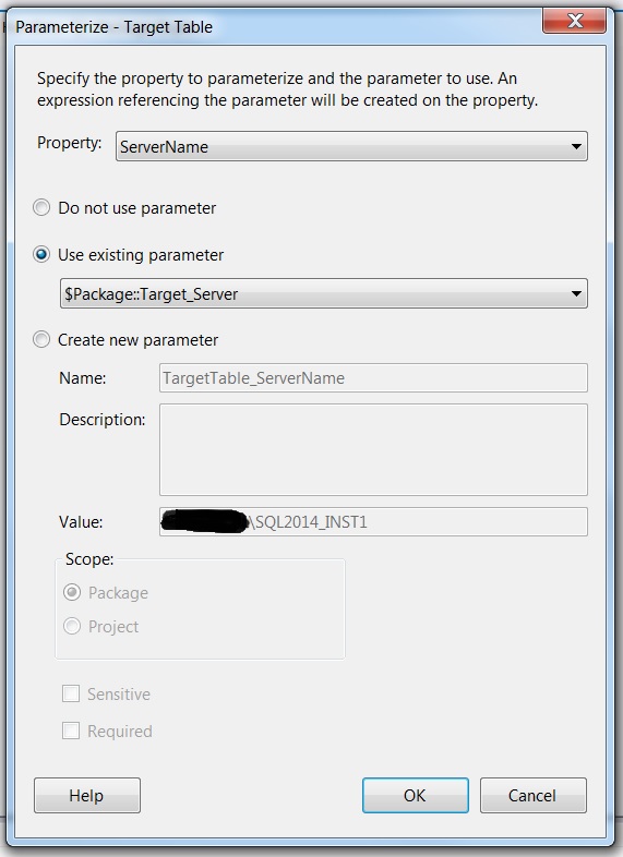 In this example above, I have associated the parameter ‘Target_Server’ with the property ‘ServerName’ of the ‘Target Table’ connection.