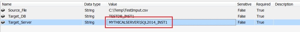 In this example I have created three – the full pathname of the input csv file (called ‘Source_File’), the target database (‘Target_DB’) and the name of the server that the database is within (‘Target_Server’). In this case all of the parameters are of type ‘string’. The value is the value I want to use at this time. The ‘sensitive’ column controls whether the parameter will be encrypted within the catalog and ‘Required’ dictates whether the parameter must be supplied or not. The ‘Description’ column is used to add a description that should prove helpful to anybody that needs to understand the purpose of this parameter.