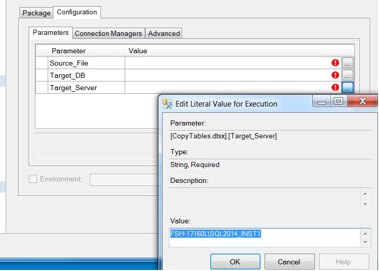 Once a project is deployed to the integration Services Catalog the parameters can be accessed by right-clicking on the project (or .dtsx name) name and selecting ‘Configure’. The tab ‘Parameters’ gives you the ability to set the parameters that were created earlier, by clicking on the ellipse at the end of each parameter line.