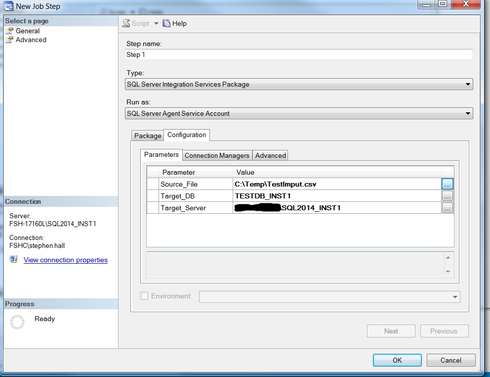 The parameters can also be set within the agent job that will be created to execute this package, via the ‘Configuration’ and then ‘Parameters’ tab of the associated step.