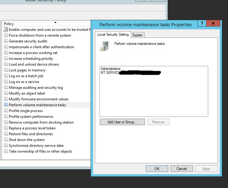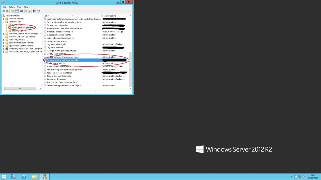 Under ‘Local Policies’/’User Rights Assignment’, locate ‘Perform volume maintenance tasks’: