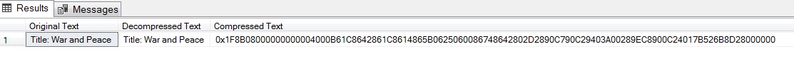 SELECT t.TextData AS [Original Text], CAST(DECOMPRESS(c.TextData) AS NVARCHAR(max)) AS [Decompressed Text], c.TextData AS [Compressed Text] FROM dbo.WarAndPeace_Text AS t INNER JOIN dbo.WarAndPeace_Compressed AS c ON c.id = t.id WHERE t.id = 8;