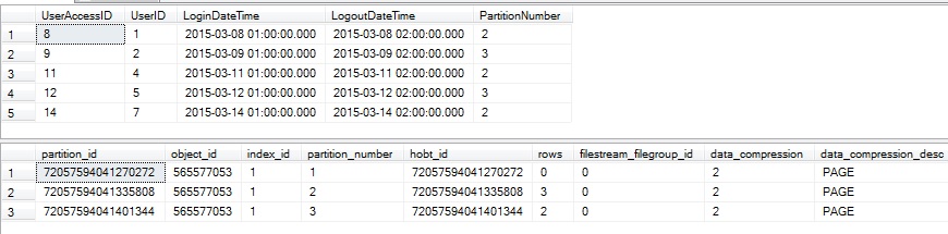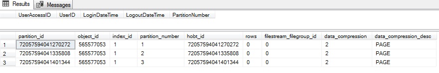 SELECT * FROM dbo.UserAccess ORDER BY UserAccessID; SELECT * FROM sys.partitions WHERE OBJECT_NAME(object_id)= 'UserAccess';