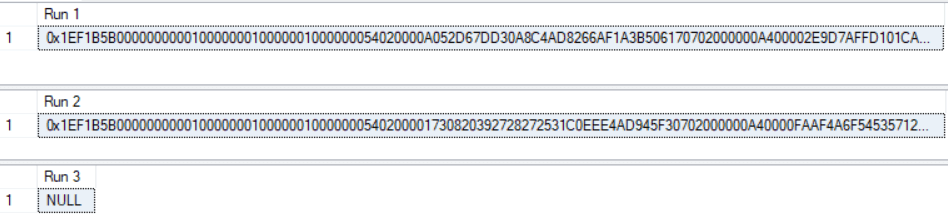 Checking the thumbprint of the certificate within the two databases (‘CertificateTest’ and ‘CopyCertificate’) shows that they have the same value. The certificate has been created from binary values in a script.