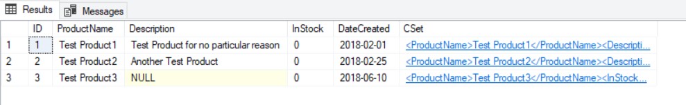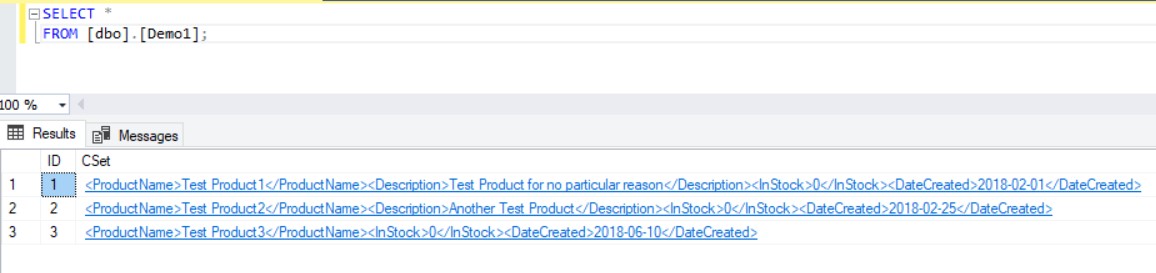 INSERT INTO Demo1([ProductName], [Description], [InStock], [DateCreated]) VALUES('Test Product1','Test Product for no particular reason',0,'01 Feb 2018'); GO INSERT INTO Demo1(Cset) VALUES('<ProductName>Test Product2</ProductName><Description>Another Test Product</Description><InStock>0</InStock><DateCreated>2018-02-25</DateCreated>'); GOFigure 1: Result from Listing 2