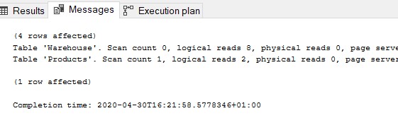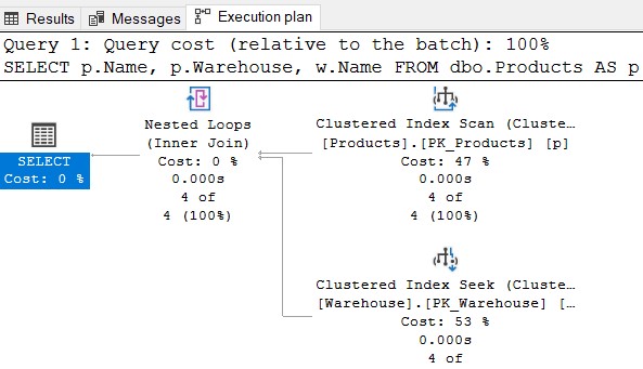 As an additional test (just, because) I have executed a query that selects based upon a specific Warehouse. I would expect an Index Seek with the following query.