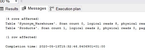 This is because we still have the ‘Warehouse’ table within the database. The synonym has have a unique name and doesn’t know (or care) if it is being used to refer to a table, function, view, stored procedure or suchlike. So if it finds an existing object with the same name, it errors.