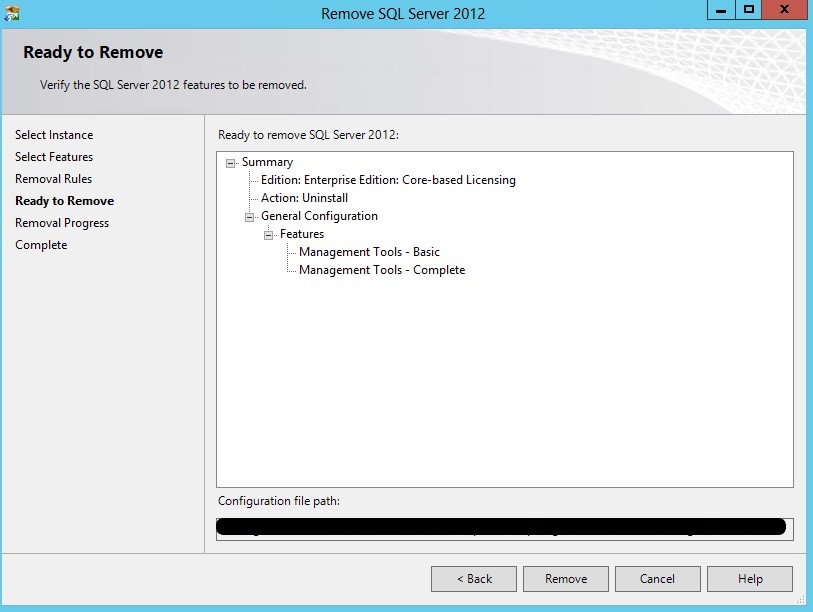 Although the dialog box is entitled ‘Ready to remove SQL Server 2012’, the summary shows that it is really just removing the Management Tools.