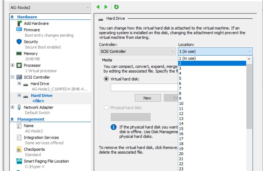 In an earlier article, I described how to set up a cluster and AG in Hyper-V. For an issue that I am now researching a solution to, I require an additional drive on my SQL Server environments. Adding a new drive to a Hyper-V VM is fairly straightforward but I had to dig around a little.