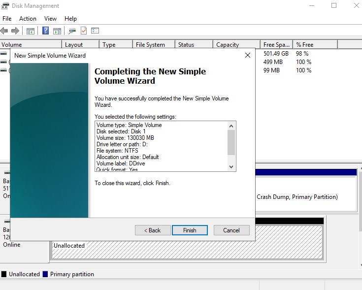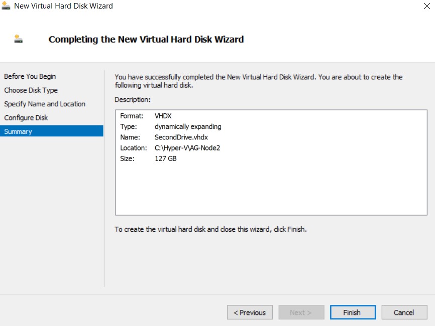 The Wizard will now show a summary – click ‘Finish’ to create the disk.