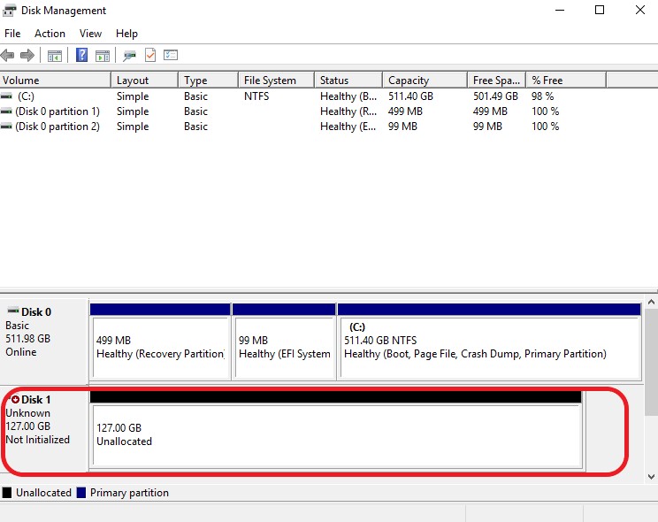This shows the attached disks. The new ‘Disk1’ is highlighted in black, signifying ‘Unallocated’.