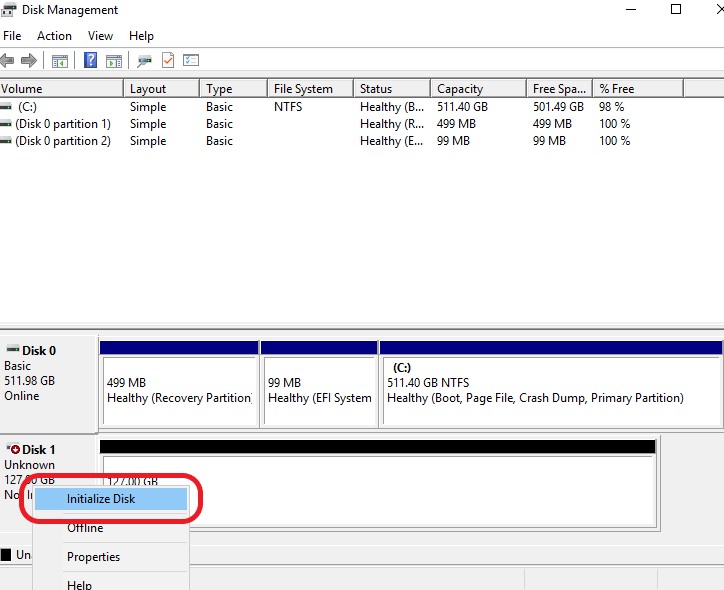 Right-click where the ‘Disk1’ name is and select ‘Online’.