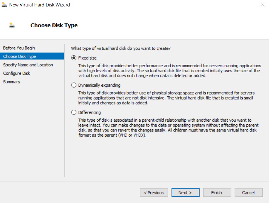 Select the type of disk – Fixed, Dynamic or Difference. I selected Fixed.