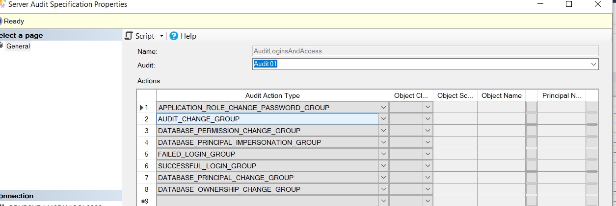 Repeat this for all entries and press ‘OK’ – the Audit Specification has no actions to audit but can be enabled without any errors.