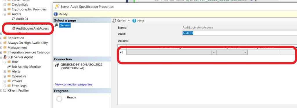 To demonstrate this, disable the Audit Specification and then right-click on it and select ‘Properties’. When the Audit Specification is disabled, you can highlight each entry and press the ‘delete’ key. The entry is removed.