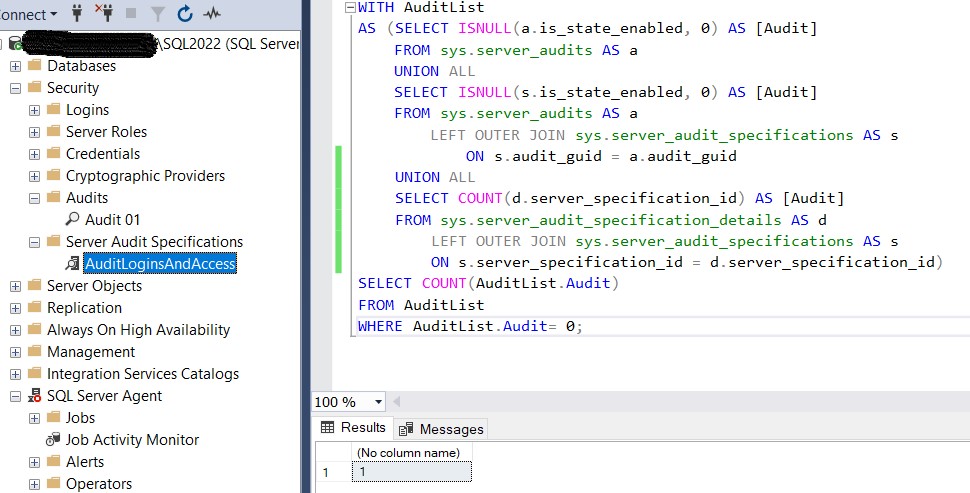 In a previous article I described the basics of setting up a SQL Server Audit. Having played around with this I have discovered ways to disable the audit without it being obvious. Therefore, I have written a small query that checks for such circumstances.
