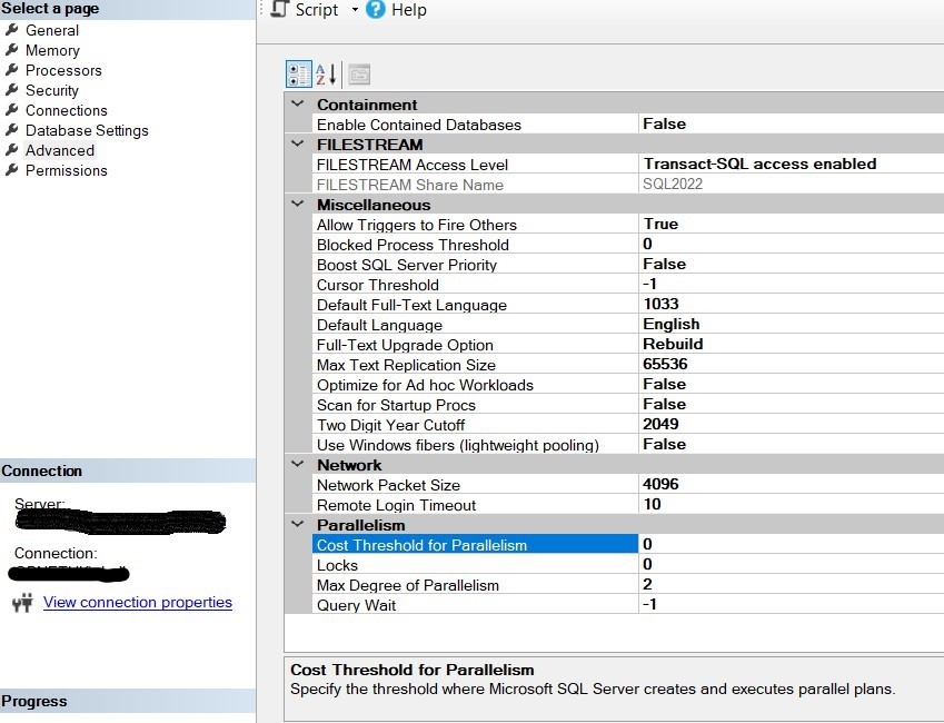 For the testing, I’ll be changing the values within the server’s ‘Max Degree of Parallelism’ (see previous image, below ‘Cost Threshold for Parallelism’) and the database’s MAXDOP setting.