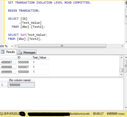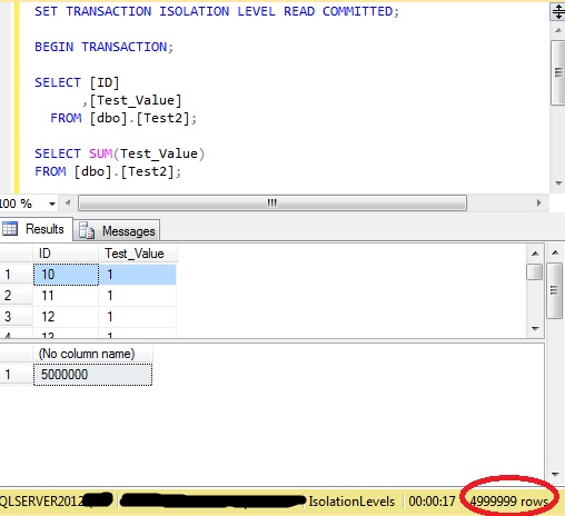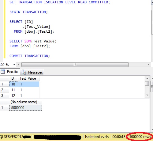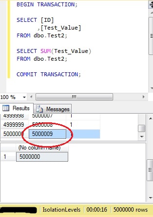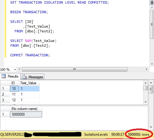 With nothing else executing against that table there are 5,000,000 rows and the sum of ‘Test_Value’ is 5,000,000: