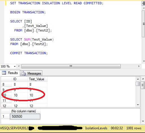 Now run the initial command, with the two SELECT statements. This will be blocked by the update, because Row 50 is locked. READ UNCOMMITTED would use this (as yet uncommitted) Test_Value and continue. READ COMMITTED will not, and is therefore blocked.