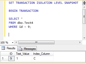 Using snapshot isolation, this shows the value of 1 for ‘Test_Value’, because at the time this transaction started the update in transaction 1 had not been committed.