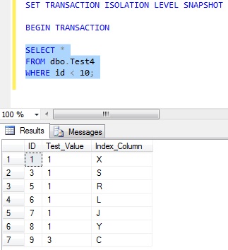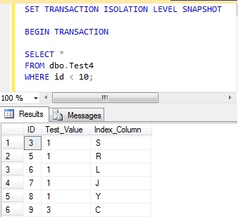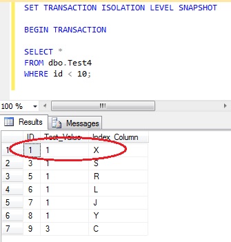 Similarly, moving the last row in the index to the start of the index does not have the impact it did with read committed isolation, for the same reason. Having reset the data and executed the appropriate UPDATE does not have the same affect, because it processed a snapshot of the data.